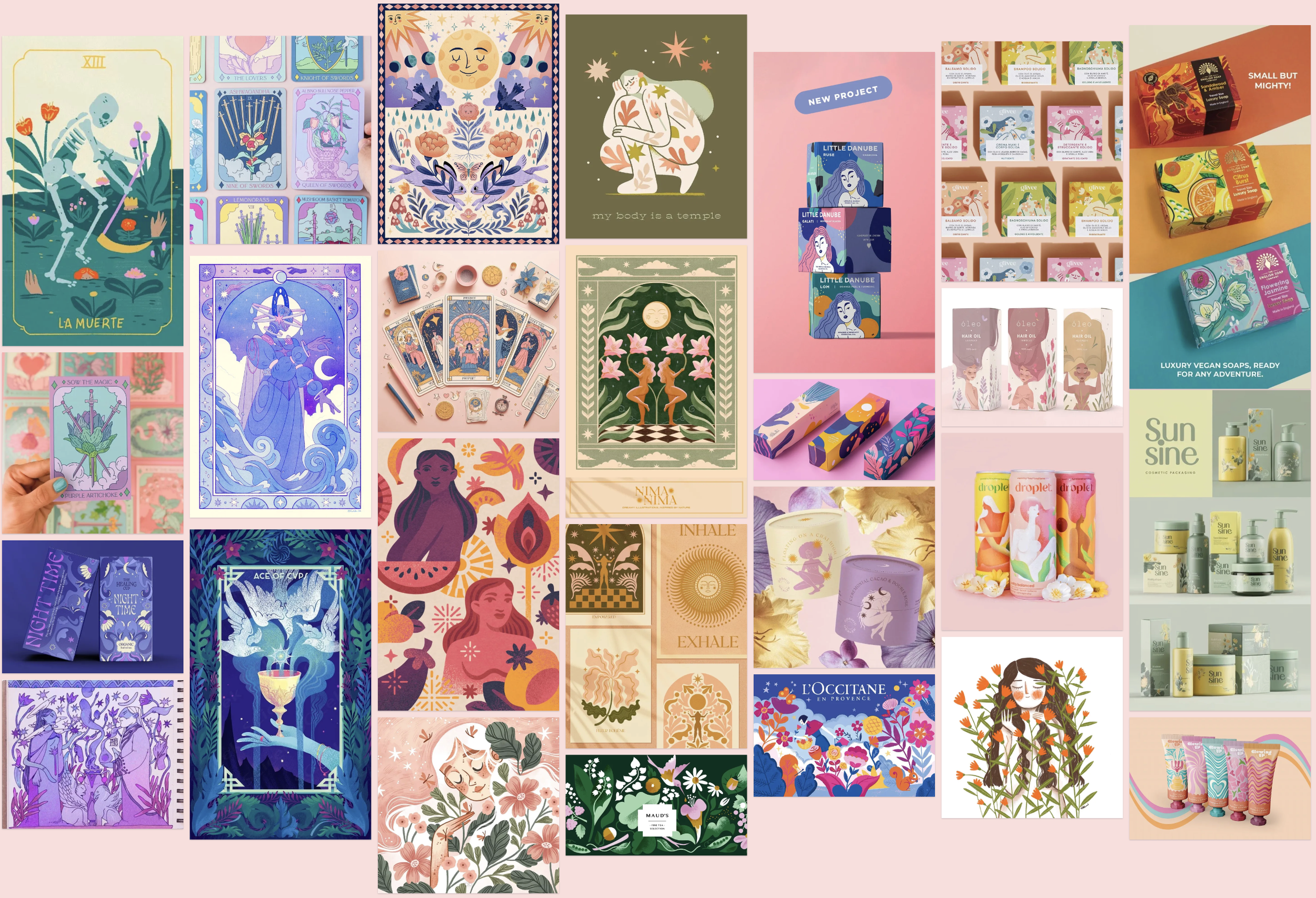 For this collection I illustrated three women to reflect the motifs often seen on tarot cards and bring a soft, feminine feel. I used calming colors and holographic elements to reflect both the soothing nature of the products and the spiritual inspiration behind the collection.