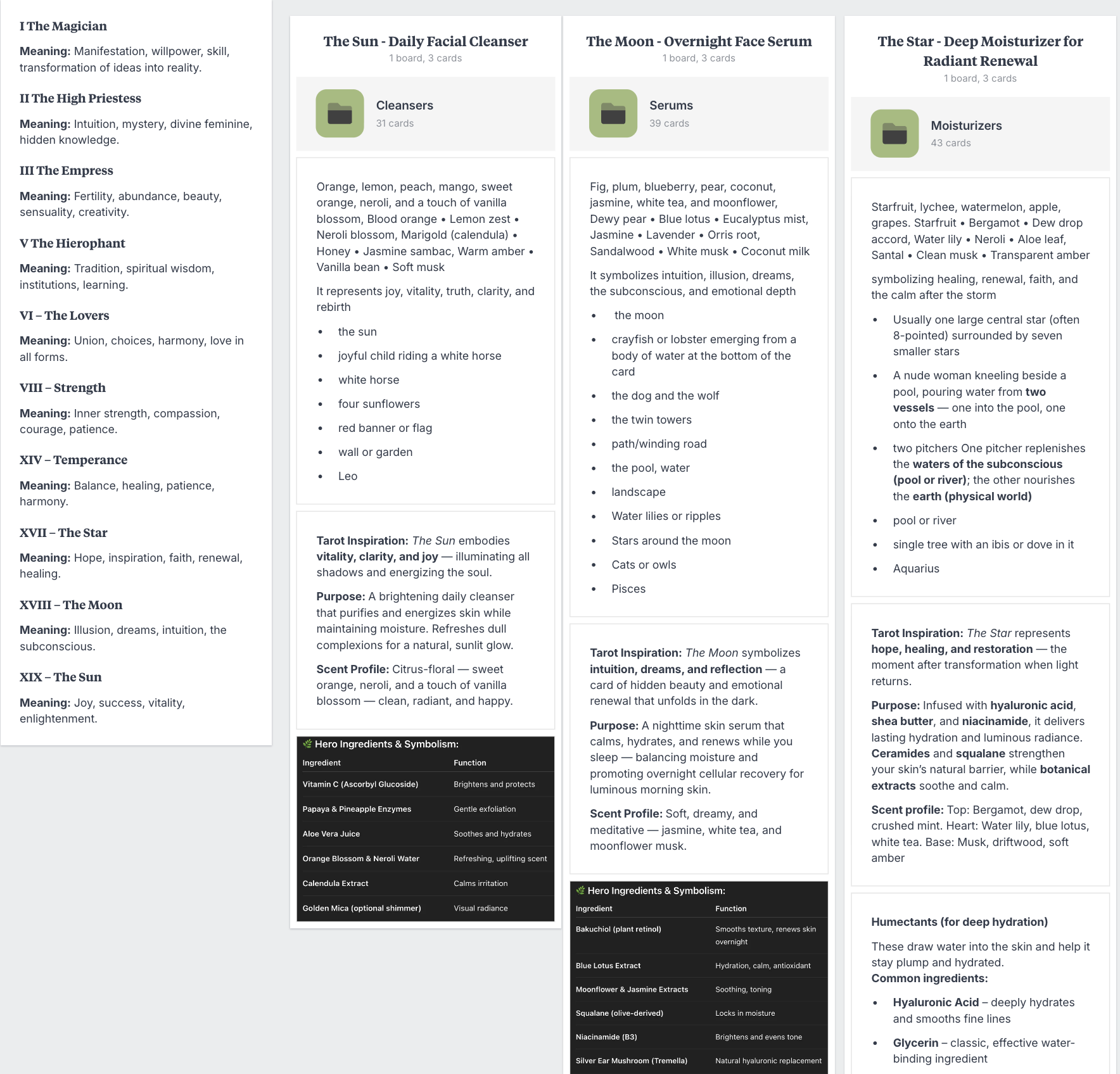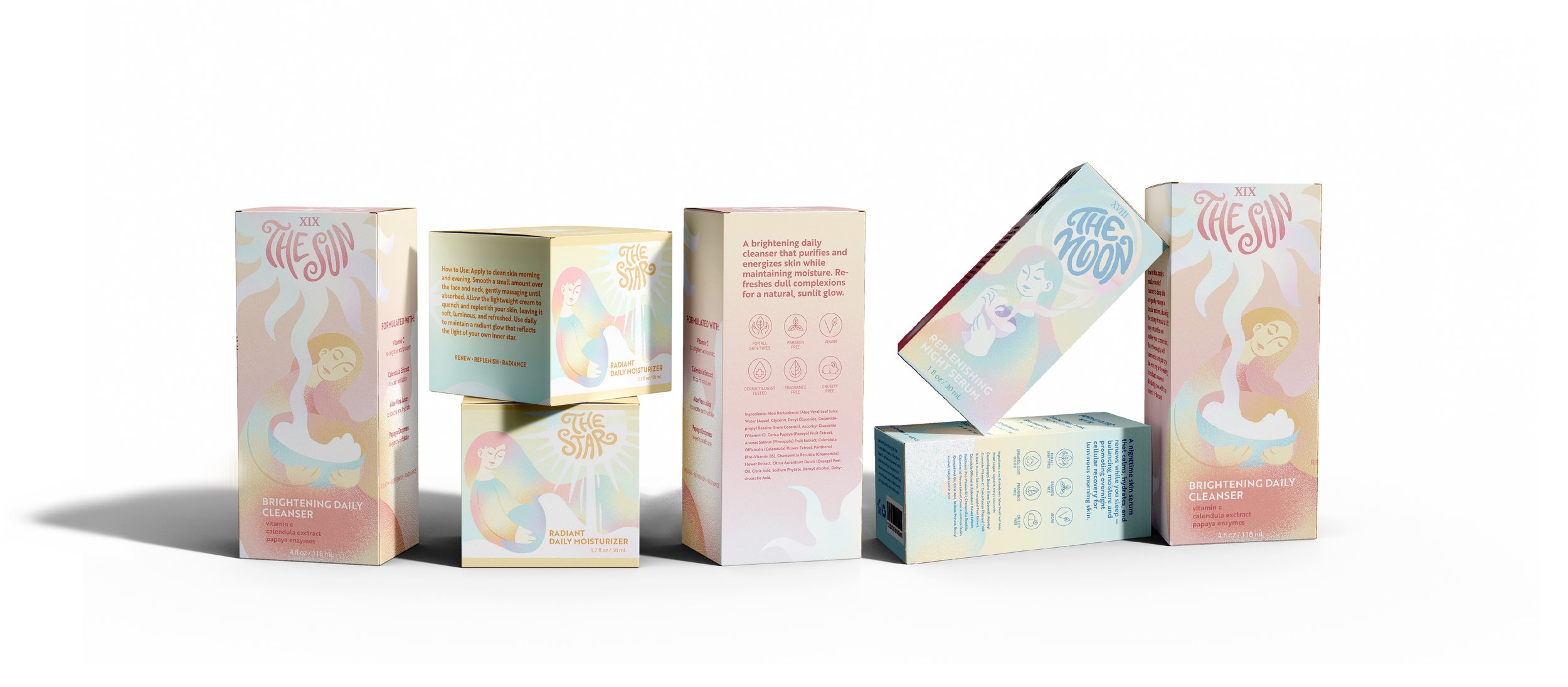 This project is a skincare packaging concept inspired by three tarot cards: The Sun, The Moon, and The Star. Each card has its own meaning and motifs, which I used as the starting point for developing three products. The Sun is a brightening daily cleanser, The Moon is a replenishing night serum, and The Star is a radiant daily moisturizer.