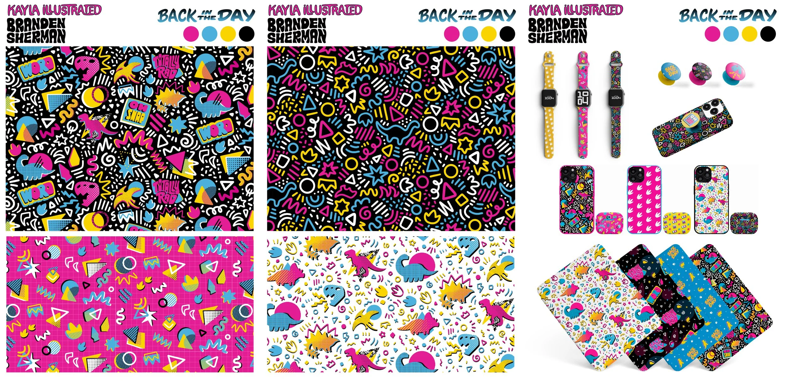 With knowledge of modern vintage revival we researched trends from the time, including the popularity of the Memphis pattern and bright neon rave hues. I took elements of dinosaurs from their silhouettes to their teeth and spines and abstracted them into geometric elements that aligned perfectly with the Memphis elements. We felt like the bright colors and patterns translated well to tech accessories.
